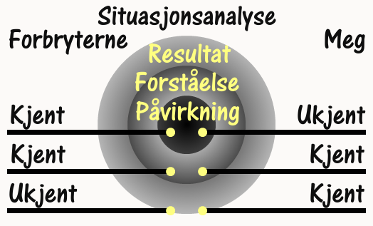 Analyse Fokuset i denne teksten er at så langt, som jeg har kommet i dag, forstår jeg at det er umulig for meg å huske hvordan disse påvirkningene er blitt gjort mot meg. Og jeg tror ikke det vill forandre seg i fremtiden. Nedenfor har jeg laget et skjematisk bilde av hvordan jeg ser på dette. I midten er påvirkningen. Omkring påvirkningen er forståelsen om den, som har forandret resultatet, som er ytterst. Forbryterne vet hva påvirkningen er, jeg vet ikke det. Både forbryterne og jeg forstår påvirkningene, men ikke på samme måten. Jeg vet hva resultatet har blitt, forbryterne vet ikke det. Det er klargjørende for meg å se på dette bildet. Det viser kjente og ukjente faktorer for forbryterne, og kjente og ukjente faktorer for meg. To kjente, og en ukjent faktor, er en sterk posisjon. Resultatet er den viktigste faktoren å vite hva er; og det er jeg som vet resultatet. Min posisjon er forholdsvis bra, den kunne ha vært mye verre.
